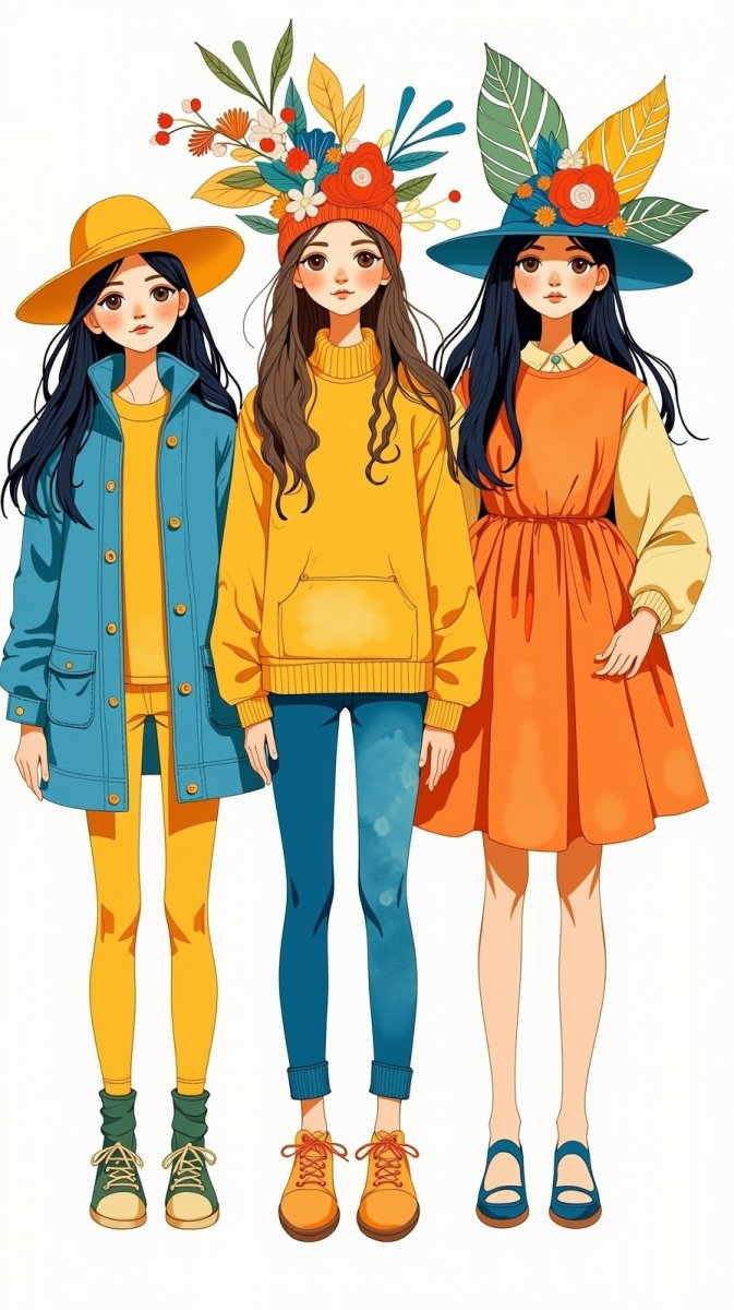 #3. paper cut gouache illustration featuring three girls in colorful outfits, one in an orange dress with blue leggings, and another wearing a yellow hat with flowers, all with long hair and minimalist background, looking at the viewers. #role_Illustration