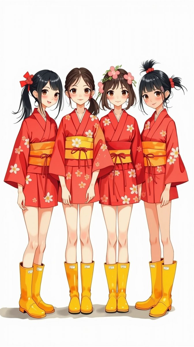 #2. naive art illustration of four young women in a line, adorned in red kimono and yellow rain boots, playful cartoonish style with simple shapes and a white backdrop, looking at the viewers. #role_Illustration