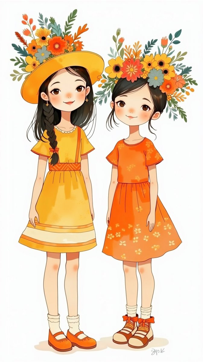 #1. folk art illustration of two young girls with a smile, one in a yellow hat with colorful flowers and the other in an orange dress, standing against a white backdrop, simplistic forms and exaggerated features, look at the viewers. #role_Illustration