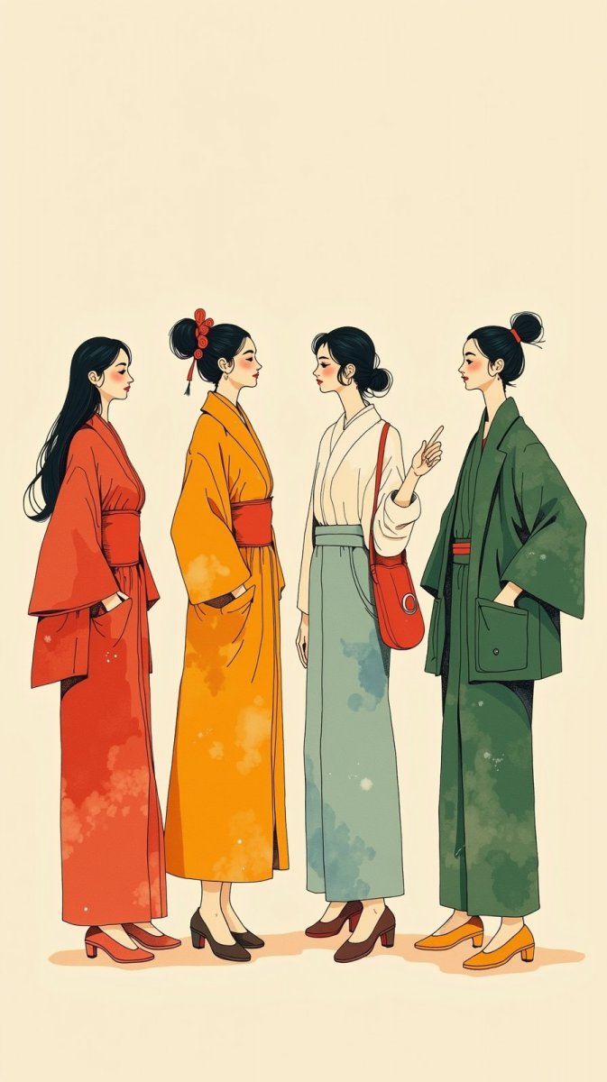 #2. naive art ink drawing of four women in brightly colored outfits, one in a red kimono and another in an oversized green jacket, minimalism and primitive figures, light beige background, interacting with the viewers. #role_Illustration