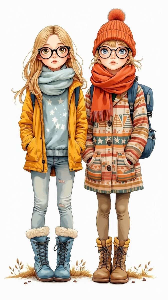 #4. zentagle illustration depicting two young girls wearing black glasses and warm clothes, one in blue boots, the other in a colorful outfit, standing with relaxed poses, set against a white backdrop, exaggerated features, look at the viewers. #role_Illustration