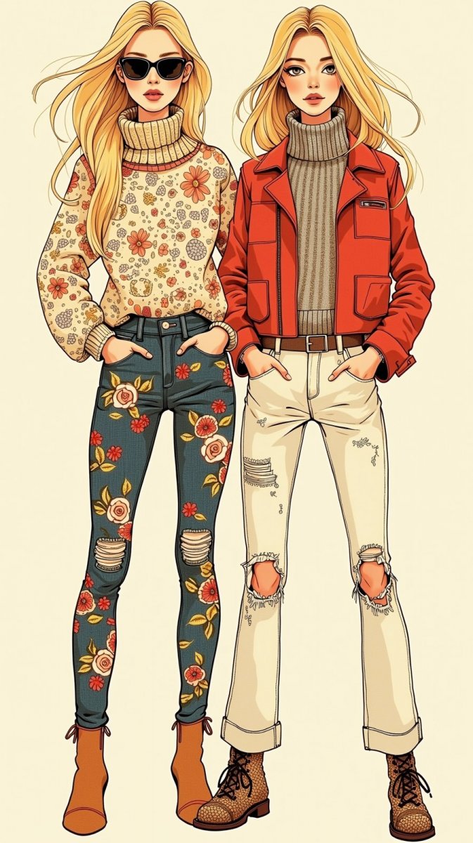 Две модницы в джинсовой вышивке и ярких куртках смотрят на зрителя. Картинка из нейросети Flux.1