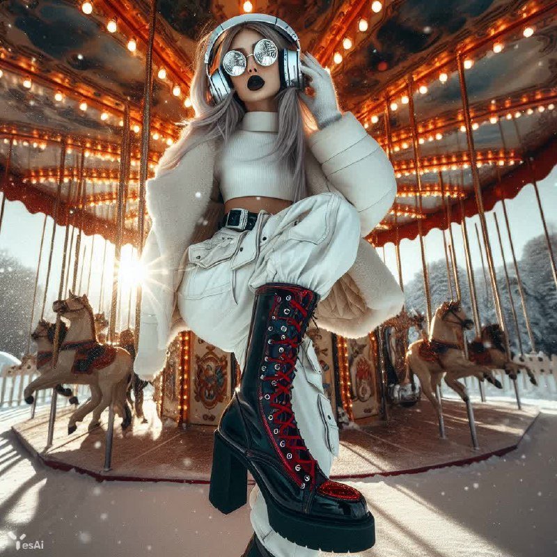 Завораживающий кадр, сотканный из динамики движения и футуристической эстетики. Молодая девушка, воплощение энергии и стиля, парит в танце на фоне заснеженного зимнего парка. Её образ – это смелое сочетание дерзости и нежности, где спортивный силуэт гармонично переплетается с элементами киберпанка и глэм-рока. Высокая посадка наушников подчеркивает погружение в мир музыки, а неоновый эквалайзер, отражающийся в звездном небе, создает атмосферу космического рейва. Детали образа продуманы до мелочей: кожаные карго-штаны и массивные биомеханические сапоги на платформе придают уверенности в каждом движении, а белая косуха с кожаными ремнями и клепками добавляет бунтарского духа. Яркие длинные волосы контрастируют с бледностью кожи, создавая эффектный визуальный акцент. Светоотражающие очки скрывают взгляд, оставляя простор для фантазии, а темные губы намекают на страсть и загадочность. Фотография словно оживает благодаря игре света и тени, подчеркивающей динамику танца и объемность деталей. Карусель в зимнем парке становится декорацией для этого футуристического перформанса, где реальность переплетается с мечтами о свободе и самовыражении. Это не просто фотография – это манифест молодости, энергии и безграничной креативности. Вид сверху позволяет рассмотреть всю масштабность сцены и почувствовать себя наблюдателем за этим невероятным танцем на фоне зимней сказки