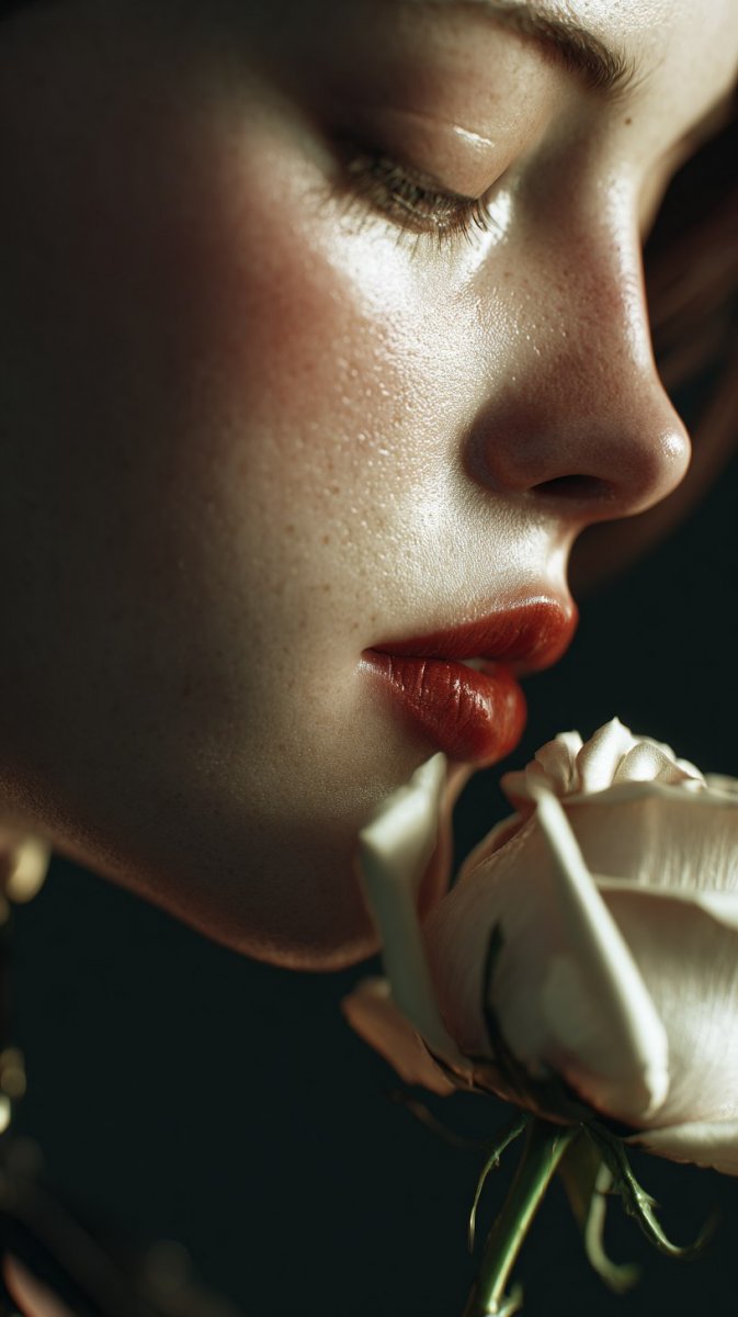 Портрет крупным планом, рот женщины со слегка приоткрытыми губами, глаза закрыты, высокие каблуки, яркая помада, раскрытые лепестки, руки держат одну розу, создают ощущение движения и энергии, темный и насыщенный фон --ar 9:16