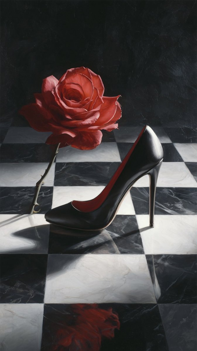 Загадочная композиция, сотканная из контрастов света и тени, представляет собой цифровое произведение искусства, где классическая шахматная доска становится фоном для неожиданного цветочного акцента. В самом центре строго упорядоченного поля черно-белых квадратов одиноко расцветает алая роза, раскрывая свои лепестки в притягательном танце красоты и хрупкости. Ее насыщенный цвет резко выделяется на фоне монохромной геометрии, создавая эффект визуального напряжения и загадочности. Дополнительный элемент – изящный женский стилетто, едва заметно проглядывающий сквозь шахматные поля, добавляет работе тонкий намек на человеческое присутствие и усиливает ее интригующий характер. Кажется, будто роза выросла прямо из твердого основания туфельницы, что создает ощущение сюрреалистической сцены, где привычные вещи приобретают новые значения. Общая атмосфера произведения пронизана мрачностью и таинственностью, словно скрывает в себе неразгаданную историю или тайну. Игра света и тени подчеркивает драматичность композиции, а вертикальный формат изображения (соотношение сторон 9:16) придает ей современный вид и акцентирует внимание на центральном элементе – красной розе, символе страсти, любви и одновременно опасности. Это не просто изображение, это визуальная метафора, заставляющая задуматься о вечных вопросах жизни и смерти, красоты и разрушения, порядка и хаоса. В ней чувствуется влияние готического стиля и декаданса, создающее ощущение таинственности и неизбежности судьбы