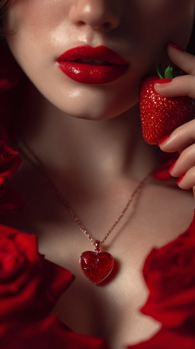 close-up of red heart-shaped pendant, strawberry placed on lips, bold red lipstick, fingers slightly curled, petals visible, overall mood of concentration and focus --ar 9:16