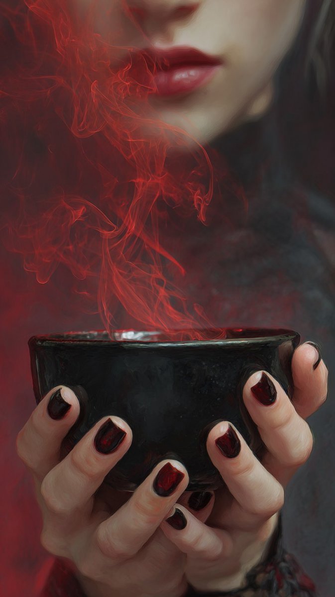 close-up portrait of hand holding black coffee cup, lips slightly parted, red smoke swirling around, nails painted glossy black polish, BG is blurred indoor space, creating sense of movement and energy --ar 9:16