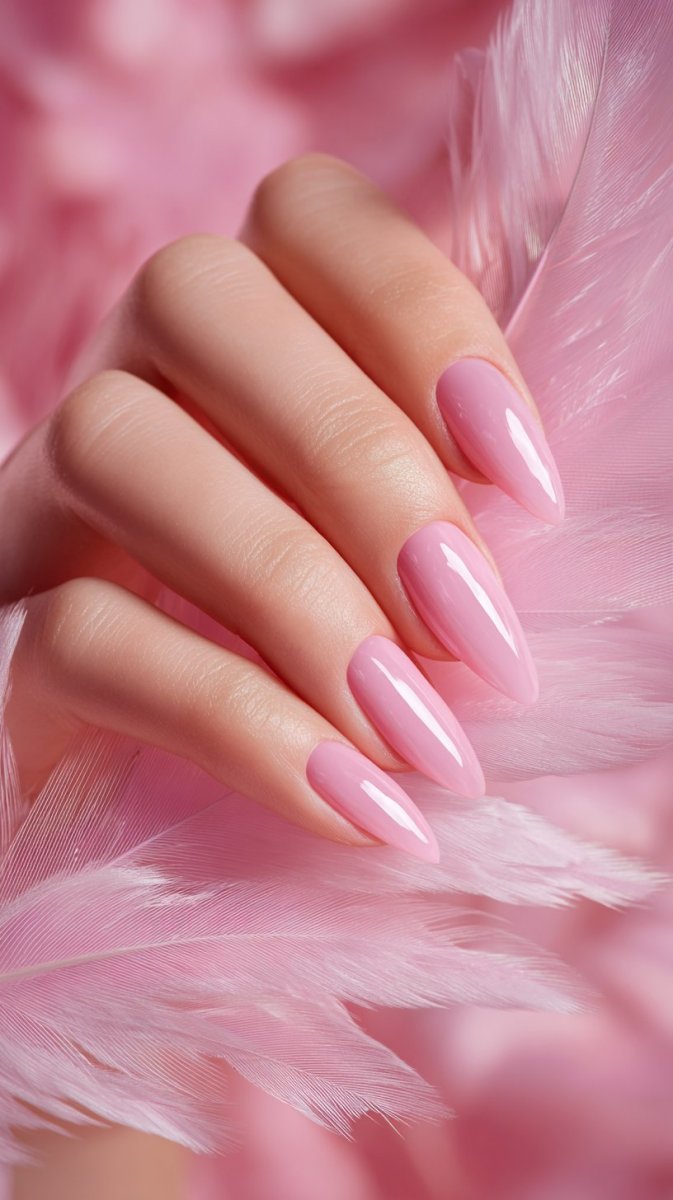 крупный план руки человека с заостренными ногтями, окрашенными в ярко-розовый цвет, глянцевая поверхность, перекрывающиеся розовые ангельские крылья, диагональные горизонтальные полосы, свежий спелый вид, фоновый рисунок — сплошной розовый цвет --ar 9:16