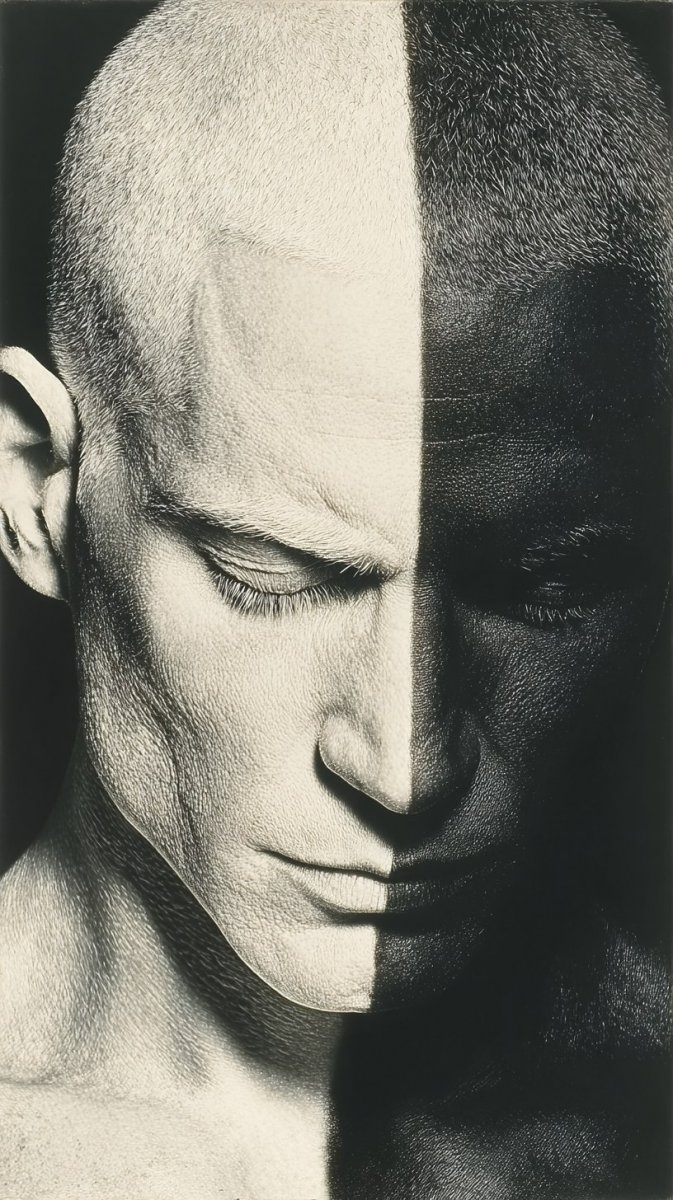 Этот завораживающий черно-белый портрет представляет собой мощное исследование идентичности и контраста. На нем изображен человек с бритой головой, чье лицо разделено на две отчетливо разные половины – одна сторона демонстрирует светлую кожу с нежным выражением лица, передающим спокойствие и умиротворение, а другая – темную кожу с серьезным взглядом, излучающим силу и решимость. Такое визуальное деление создает интригующий эффект двойственности, приглашая зрителя задуматься о многогранности человеческой натуры и сложностях самовосприятия. Фон из отражающего металла добавляет портрету глубины и загадочности, словно символизируя переменчивость жизни и постоянно меняющиеся перспективы. Минималистичный подход к композиции подчеркивает чистоту линий и акцентирует внимание на выразительных лицах, позволяя эмоциям говорить сами за себя. Фотореализм изображения создает ощущение подлинности и реалистичности, будто зритель смотрит на живого человека, а не на фотографию. Этот профессиональный снимок выполнен в стиле raw, что означает отсутствие постобработки и ретуши, сохраняя естественную текстуру кожи и нюансы освещения. Высокое разрешение (s 750) обеспечивает невероятную детализацию и четкость изображения, позволяя рассмотреть мельчайшие морщинки, поры и оттенки цвета. В целом, этот портрет является выдающимся образцом современного искусства фотографии, сочетающим в себе техническое мастерство, художественное видение и глубокий смысл. Он заставляет задуматься о природе идентичности, принятии различий и красоте человеческого разнообразия. Это произведение способно вызывать сильные эмоции и оставлять неизгладимое впечатление на зрителя своей мощной выразительностью и эстетической привлекательностью