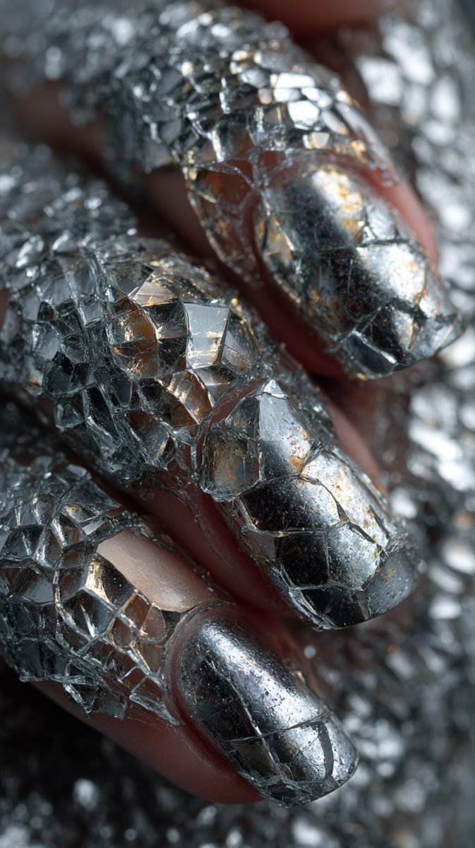 Разбитое стекло и отражение света в длинных металлических ногтях - Картинка, сгенерированная нейросетью Midjourney