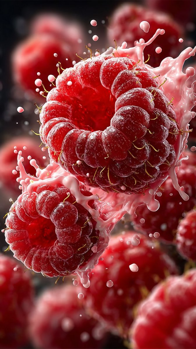 Изысканная композиция, где сочная малина рассыпается по всему пространству, создавая ощущение безграничного лета и сладкого наслаждения. Каждая ягодка прорисована с невероятной детализацией, демонстрируя аппетитную текстуру и насыщенный розовый оттенок. Игра света и тени подчеркивает объемность фруктов, а брызги нежного розового молока, словно акварельные мазки, добавляют легкости и воздушности изображению. Поверхность малины присыпана мерцающей золотой пылью, придавая ей сказочный вид и ощущение роскоши. На темном фоне, как будто вырезанные из бархата, выделяются несколько лимонов, создавая гармоничный контраст цветов и форм. Использование HD разрешения, ярких насыщенных оттенков и гиперреалистичной техники позволило добиться потрясающего фотореализма, погружающего зрителя в мир свежих фруктов и летнего блаженства. Картина излучает позитив и энергию, вызывая желание насладиться этим визуальным пиршеством. Это не просто изображение малины, это настоящее произведение искусства, воплощающее красоту природы во всей ее полноте и великолепии. Каждый элемент тщательно проработан, чтобы создать неповторимую атмосферу свежести, сладости и изысканности