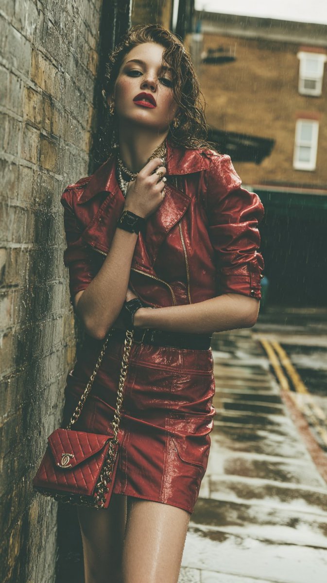 Смелое сочетание высокой моды и бунтарского духа на обложке глянцевого журнала. Перед зрителем дерзкая модель в красном свитере и чулках – воплощение современного стиля с отсылкой к панк-эстетике. Ее образ подчеркнут черными сетчатыми колготками, добавляющими нотку провокации и индивидуальности. Позирующая на углу улицы, она уверенно держит в руках культовую сумку Chanel, символизирующую роскошь и безупречный вкус. Фотография выполнена в стиле винтажной пленки, придавая изображению особую атмосферу и глубину. Идеально сложенная фигура с тонкой талией демонстрирует изящество и грацию. Это не просто фотография – это манифест уверенности, свободы самовыражения и неповторимого стиля. Образ излучает энергию и бунтарский дух, отражая тенденции современной моды и вдохновляя на создание смелых и запоминающихся образов. Вся композиция пронизана атмосферой урбанистического шика, где классическая элегантность переплетается с дерзким бунтом, создавая уникальный визуальный эффект. Это взгляд в мир моды, где нет места компромиссам и ограничениям