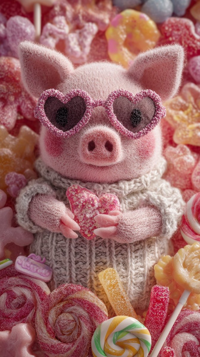 Милый розовый поросенок в очках сердца из конфет ручной работы - Пример работы ИИ Midjourney