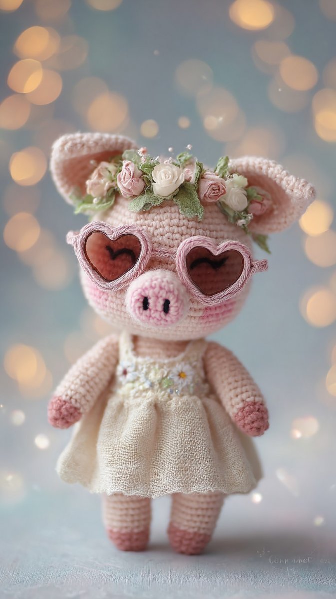 a hand-crocheted pink piggy doll with big eyes, heart-shaped sunglasses, and a floral headband, wearing a pink dress, on a white background with blurred lights, remarkable lifelike appearance, in pastel colors, simple design #role_amigurumi
