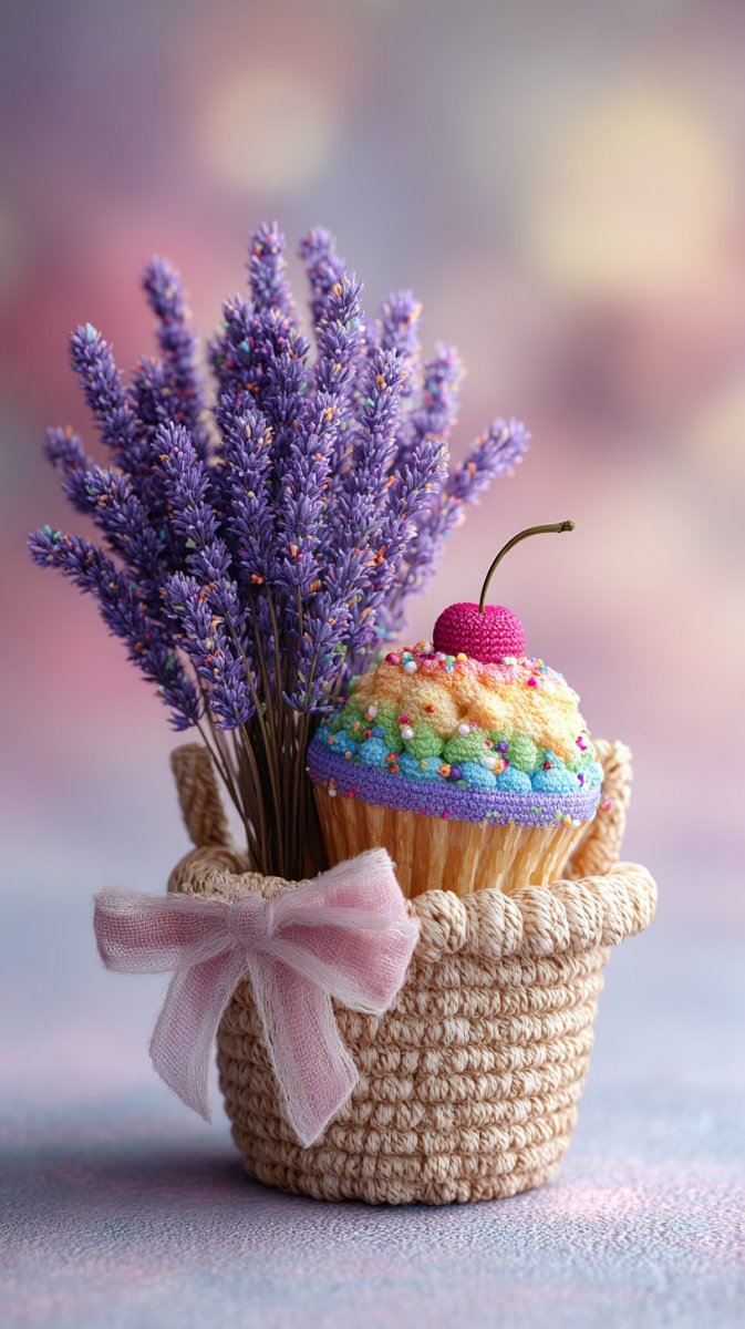 Вязаные чудеса: корзинка с лентой и лаванда, милый кекс из пряжи - Изображение, созданное нейросетью Midjourney