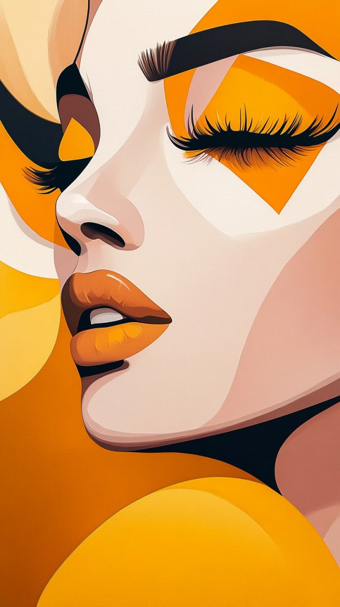 a woman’s face showcasing creative makeup with a yellow triangle and orange square. large dramatic eyes with long lashes and bold lips, accented by swirls and curves against a blurred bg. sleek ponytail contrasts sharply with a plain white design, evoking a mysterious atmosphere.