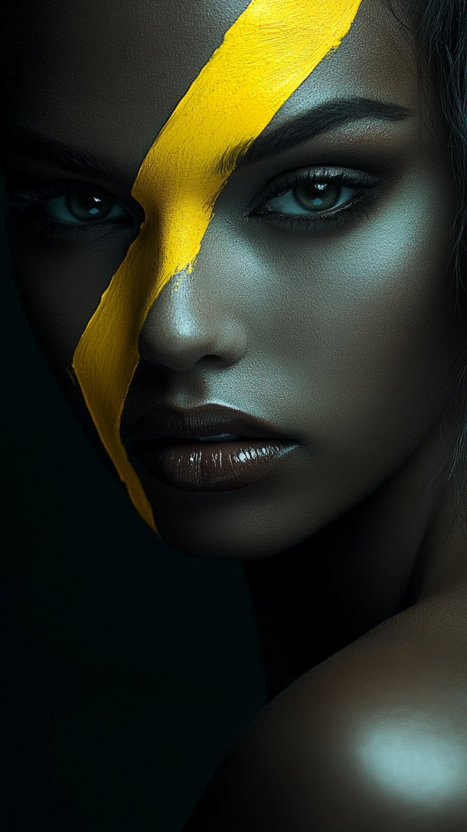 Впечатляющий портрет женщины, олицетворяющий собой смелый сплав искусства и силы духа. Лицо и верхняя часть тела украшены ярким рисунком в жёлтых и чёрных тонах – дерзким сочетанием цветов, создающим визуальный контраст и притягивающим взгляд. Выразительный нос акцентирован смелыми линиями, а зигзагообразный узор добавляет динамики и энергии образу. Взгляд женщины прямой и серьёзный, он проникает в душу зрителя, не оставляя равнодушным. Чётко очерченные чёрные стрелки на правом глазу подчеркивают глубину её взгляда и придают портрету загадочности. Гладкие, прямые волосы ниспадают по плечам, создавая мягкий контраст с резкими линиями рисунка на лице. Фон нейтрального серого цвета позволяет полностью сосредоточиться на выразительном образе женщины. Этот минималистичный фон не отвлекает внимание и позволяет детально рассмотреть детали макияжа и рисунка на коже. В целом, портрет излучает уверенность, силу и неповторимую индивидуальность, являясь настоящим произведением современного искусства. Это яркое свидетельство креативности и смелости художника, который смог передать сложный характер модели через сочетание цвета, формы и композиции. Кажется, будто за этой маской скрывается глубокая история, которую хочется разгадать