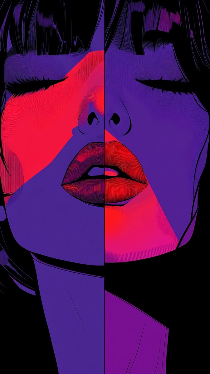 Игривая геометрия на фоне дерзкого красного цвета создает захватывающий визуальный контраст. Лицо девушки становится холстом для черно-белой полосы, ритмично идущей по горизонтали – словно отражение пульсирующего современного города. Яркие геометрические фигуры, взрывающиеся в насыщенных оттенках алого, синего и пурпурного, добавляют динамики и энергии этому портрету. Губы, окрашенные в глубокий черный цвет, выделяются на фоне более светлых тонов кожи, подчеркивая их выразительность и загадочность. Этот образ – сплав графической четкости и буйства красок, где каждый элемент тщательно выверен для создания незабываемого визуального впечатления. Это не просто портрет; это манифест современного искусства, сочетающий в себе силу геометрии, смелость цвета и чувственность женского облика. Контрастное сочетание черного и белого создает ощущение движения, а яркие акценты привлекают внимание к деталям, заставляя зрителя рассматривать изображение снова и снова. Глубокий красный фон усиливает драматизм композиции, подчеркивая яркость и выразительность основных элементов. Это визуальная поэма о красоте, смелости и творчестве, воплощенная в одном запоминающемся образе