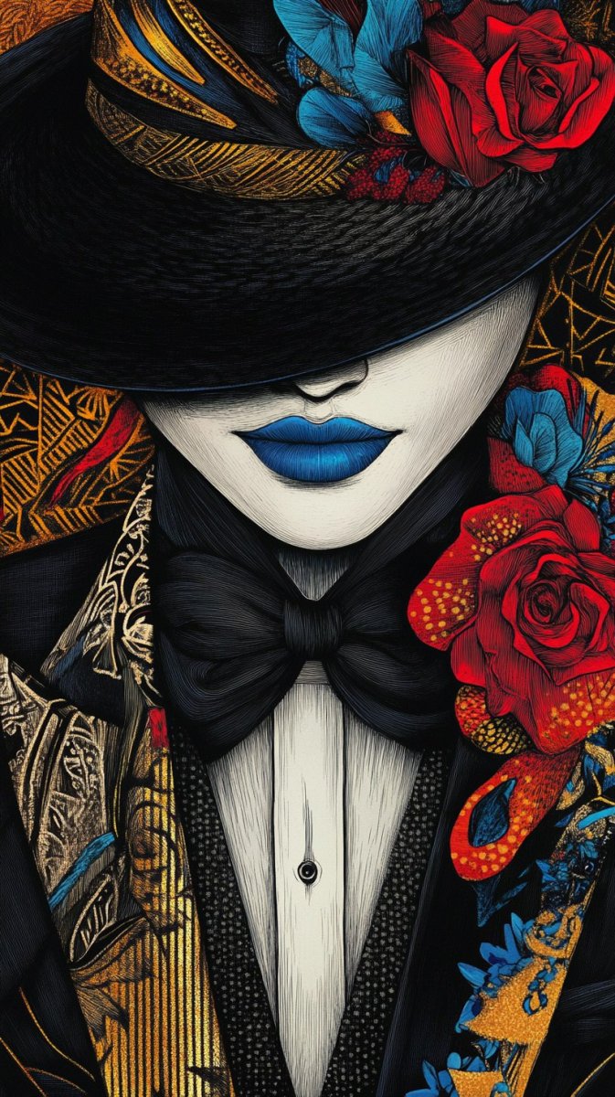 Элегантный черный смокинг демонстрирует неповторимый художественный дизайн с необычными полосами, расположенными горизонтально и образующими зигзагообразный узор. Сверху доминирует крупный цветок, добавляющий яркости и изысканности. Лицо украшено глубоким синим оттенком, создающим смелый и драматичный эффект. Черно-красный и желтый макияж лица формируют геометрический центр, резко контрастирующий с элегантной шляпой. Эта композиция воплощает собой дерзкий стиль и смелое самовыражение, где каждый элемент тщательно продуман для создания запоминающегося образа. Игра текстур и цветов подчеркивает уникальность дизайна, превращая смокинг в настоящее произведение искусства. Сочетание классической элегантности черного цвета с яркими акцентами создает визуальный эффект, привлекающий внимание и оставляющий неизгладимое впечатление. Этот наряд предназначен для тех, кто не боится выделяться из толпы и ценит оригинальность в каждой детали. Он идеально подойдет для особых мероприятий, где требуется подчеркнуть индивидуальность и чувство стиля. В целом, это смелый и выразительный образ, который сочетает в себе элегантность, креативность и драматизм