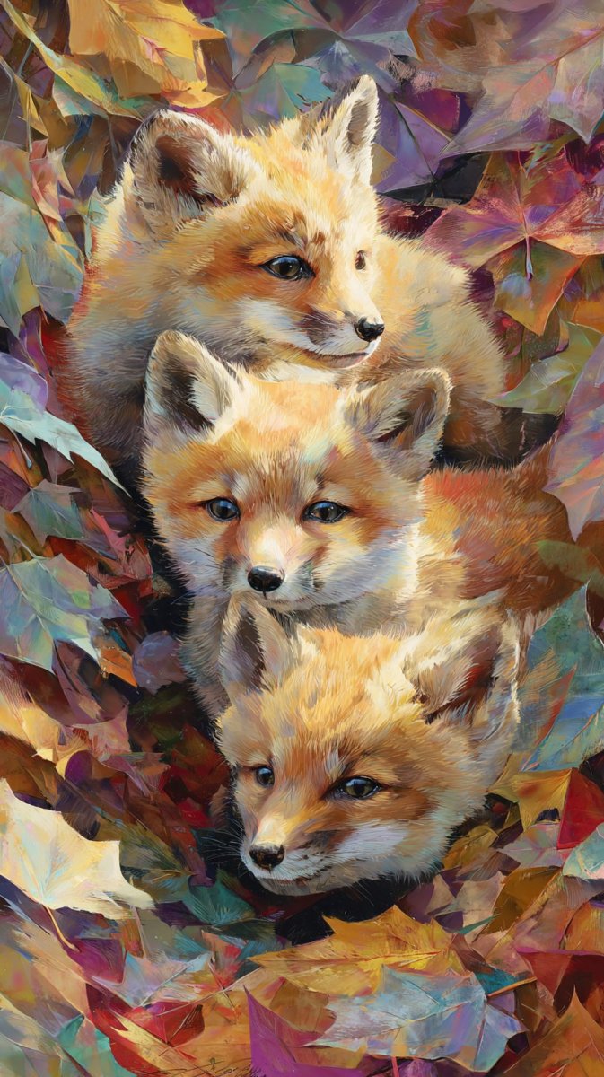 playful fox cubs, surrounded by a bed of colorful autumn leaves, capturing candid moments of curiosity and mischief, warm golden light filtering through trees, depicting nurturing family bond, enhanced with whimsical textures and soft focus, inviting wilderness atmosphere.