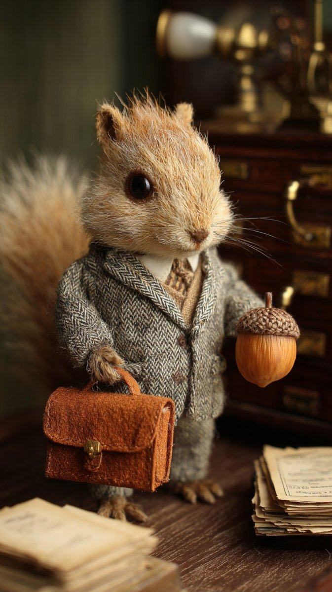 dapper squirrel in a miniature suit, holding acorn-shaped briefcase, seated at a tiny desk with tiny paper stacks, detailed expression showcasing determination and charm, backdrop of miniature office setting, warm lighting giving a feel of cozy productivity, playful realism in composition.