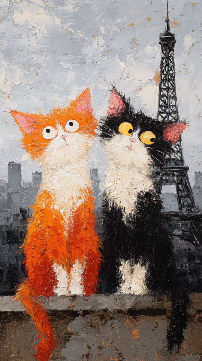 cute cartoon cats, oil painting-style illustration, abstract art, simple lines, paris city backdrop, showcasing lush coat with rich gradient, bright green eyes glistening with curiosity, symmetrical composition, flat style, vibrant colors, capturing playful spirit, BG is bold black and white stripes.