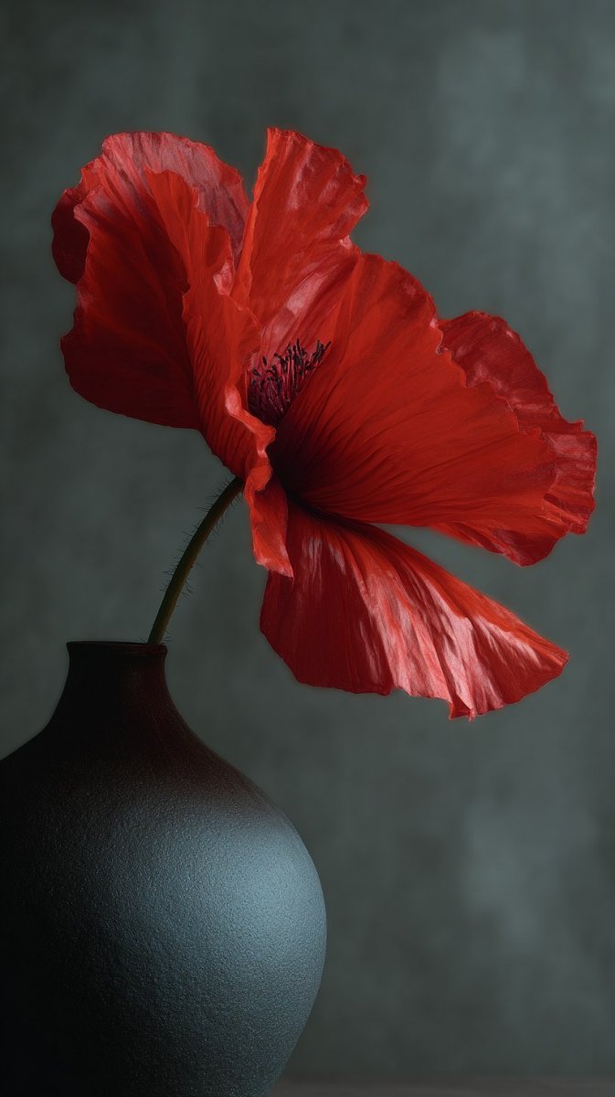 Изящный макроснимок демонстрирует алый цветок в контрастной черной вазе, создавая эффектную художественную композицию. Мягкий рассеянный свет и едва заметные тени на светло-сером фоне подчеркивают красоту лепестков, придавая изображению глубину и объем. Акцент сделан на насыщенности цвета, форме бутона и элегантном сочетании цветов, что делает фотографию привлекательной для любителей флоры и искусства. Изображение излучает спокойствие и гармонию, приглашая зрителя насладиться деталями природной красоты, представленной в изысканной манере. Фотография идеально подходит для оформления интерьеров, использования в качестве обоев на устройствах или для создания вдохновляющих визуальных материалов. Контраст между ярким цветом цветка и темным фоном усиливает драматический эффект, делая акцент на главном объекте съемки. Это настоящее произведение искусства, запечатлевшее мимолетную красоту природы в деталях. В целом, фотография создает ощущение утонченности и изысканности, демонстрируя мастерство фотографа в создании гармоничной композиции