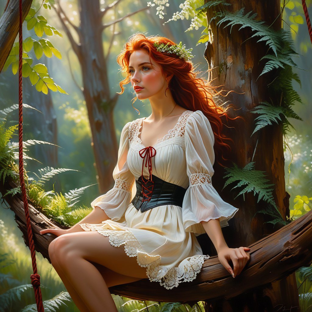 Portrait oil painting of a redhaired woman seated on a rustic wooden swing hung from a massive ancient tree in an enchanted forest - wearing a cream lace blouse, a fitted leather waistcincher and a short red skirt with lace trim, feet unshod and delicate floral hair accents. Lilyofthevalley vines climb the swing ropes, ferns and dappled leaf litter cover the ground, soft mist drifts in the background; close portrait composition, gentle threequarter pose with a subtle, contemplative expression. Masterpiece oil style with rich impasto texture and visible, expressive brushstrokes, pronounced tactile detail on skin, fabric and weathered wood; dra...
