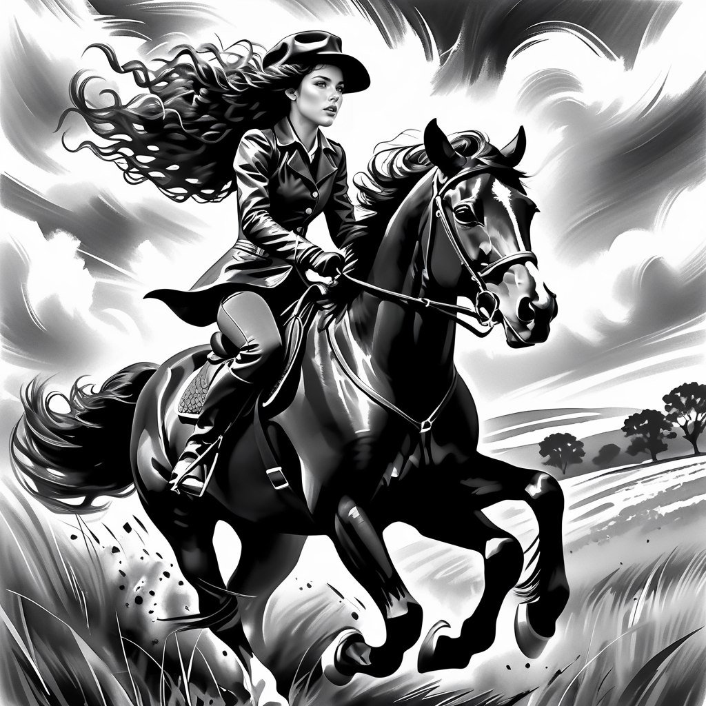 Динамичная и детализированная иллюстрация, выполненная в технике графики карандашом и чернилами, завораживает своей энергией и контрастностью. Четкие линии и острые углы создают ощущение движения и драматизма, а умелое использование штриховки придает изображению глубину и объем. Композиция представляет собой трехчетвертный поворот, позволяющий рассмотреть девушку в свободной позе во всей ее красе. В центре внимания – девушка, стремительно скачущая через луг на вороном коне. Ее длинные кудрявые волосы развеваются на ветру, подчеркивая скорость и легкость происходящего. Стильный берет и кожаные перчатки добавляют образу нотку элегантности и авантюризма. Она наклонена вперед, обхватив гриву коня, словно сливаясь с ним в единое целое. Конь кажется почти парящим над землей, его мощные мышцы напряжены, готовые к рывку. Впечатляющим дополнением к этой картине является бегущий параллельно чета – символ скорости и дикой свободы. Его стремительное движение создает дополнительный визуальный эффект и усиливает ощущение динамики. Черно-белая палитра придает изображению классический вид, а высокая детализация позволяет рассмотреть мельчайшие нюансы в выражении лиц персонажей и текстуре материалов. Вся сцена наполнена ощущением беззаботности, скорости и единения с природой, оставляя зрителя в восторге от мастерства исполнения и захватывающей атмосферы. Иллюстрация передает ощущение монументальности и силы духа