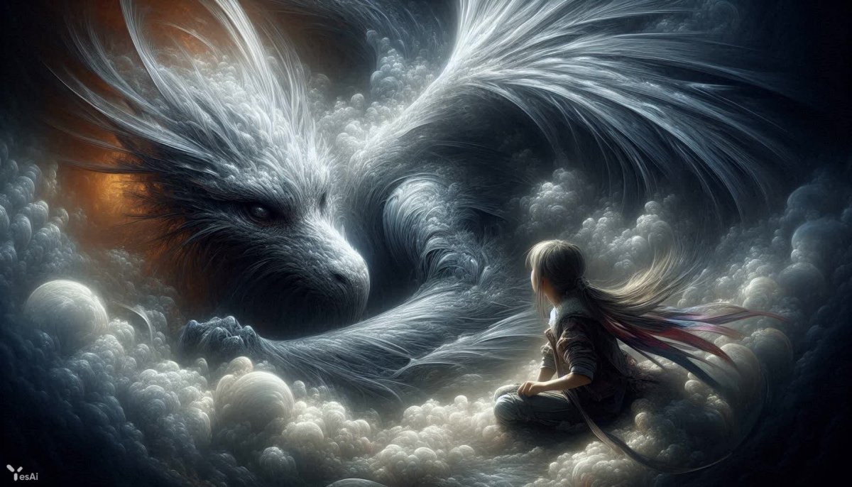 Девушка и спящий монстр в тумане: цифровой набросок с элементами тонализма - Пример изображения из нейросети Dalle