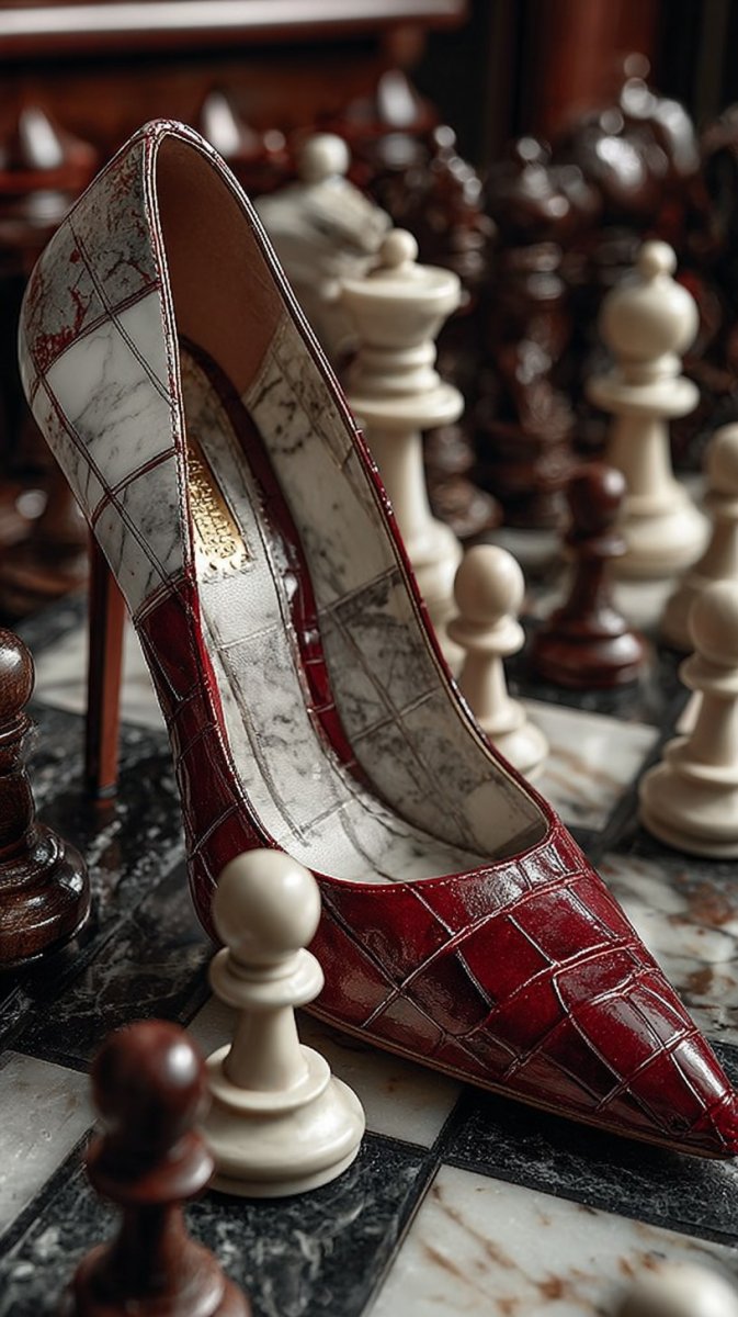 close-up of shiny red high-heeled shoe on black and white chessboard, pieces arranged strategically, mood of concentration and elegance --s 750