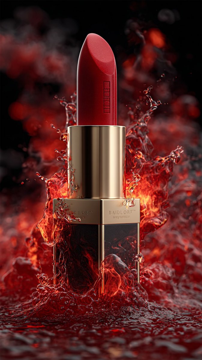 digital art piece of lipstick with red flames, gold cap, dark background, intense colors creating a dramatic feel, focus on flames licking the lipstick --s 300