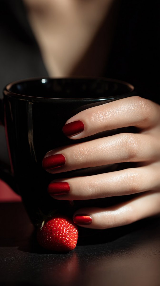 close-up portrait of hand holding black coffee cup, wearing glossy black polish, lips slightly parted, nails painted red, strawberry placed on lips, BG is blurred, dramatic and intense mood