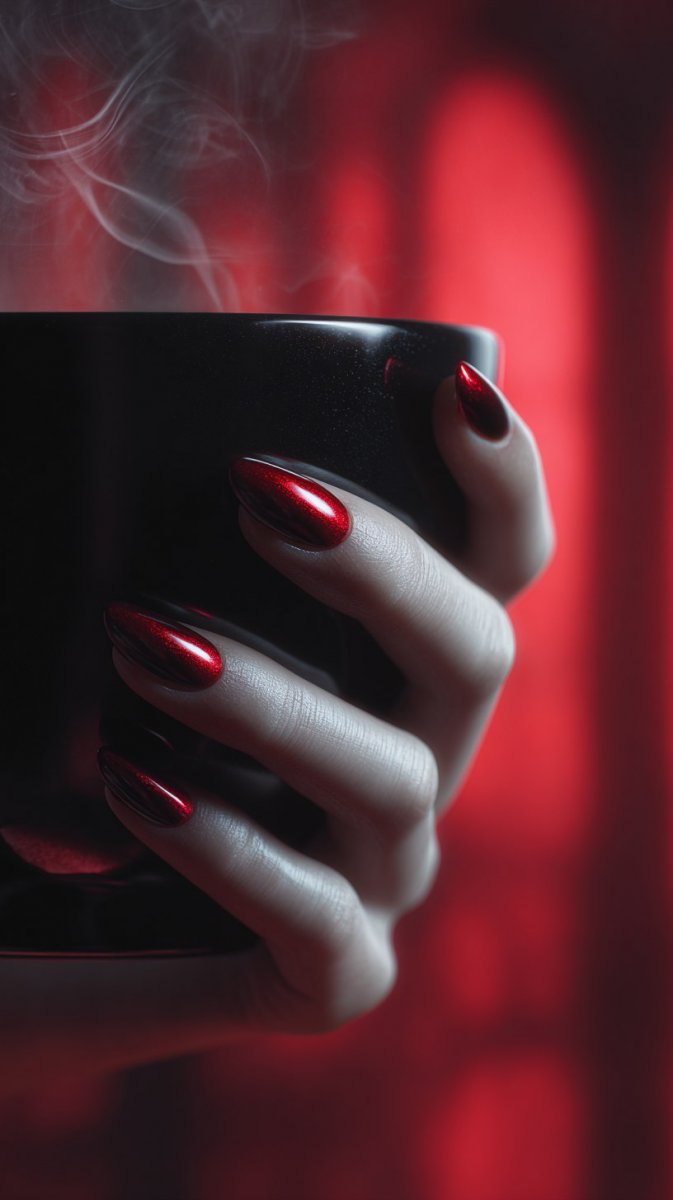 Изысканный момент утренней роскоши запечатлен в этом завораживающем портрете. В центре внимания — рука, бережно удерживающая черную чашку с ароматным кофе, акцент на котором делают ярко-красные губы, слегка приоткрытые в предвкушении глотка. Идеально ухоженные ногти, покрытые блестящим черным лаком, добавляют образу нотку дерзости и элегантности. Вокруг руки танцует завораживающий вихрь красного дыма, создавая атмосферу таинственности и страсти. Взгляд притягивает крупный овальный камень глубокого рубинового оттенка, словно символ скрытой силы и внутреннего огня. Размытый фон с арками подчеркивает камерность сцены и создает ощущение уединения. Общее впечатление – драматичное и напряженное, пронизанное чувственностью и загадочностью. Это не просто фотография — это визуальная поэма о красоте, силе и мимолетных удовольствиях. Каждая деталь, от насыщенности цветов до текстуры дыма, работает на создание неповторимой атмосферы, погружая зрителя в мир роскоши и интриги. В этом снимке идеально сочетаются классическая элегантность и современный художественный подход, делая его поистине запоминающимся произведением искусства. Он передает ощущение момента, запечатленного во времени, и оставляет после себя стойкое впечатление глубины и насыщенности