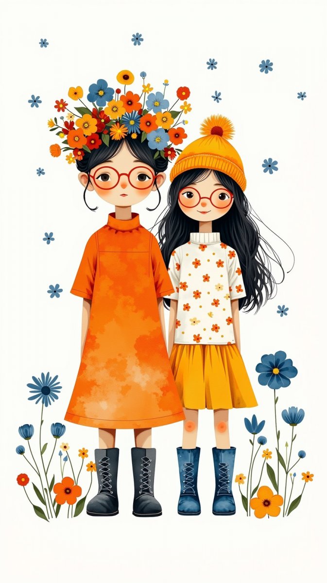 #2 illustration, two young girls standing side by side, orange dress and blue boots, yellow hat adorned with colorful flowers, black hair and red glasses posing closely together, exaggerated features, white backdrop scattered blue flowers, primitive figures, simple shapes, minimalism, folk art, look at the viewers #role_Illustration