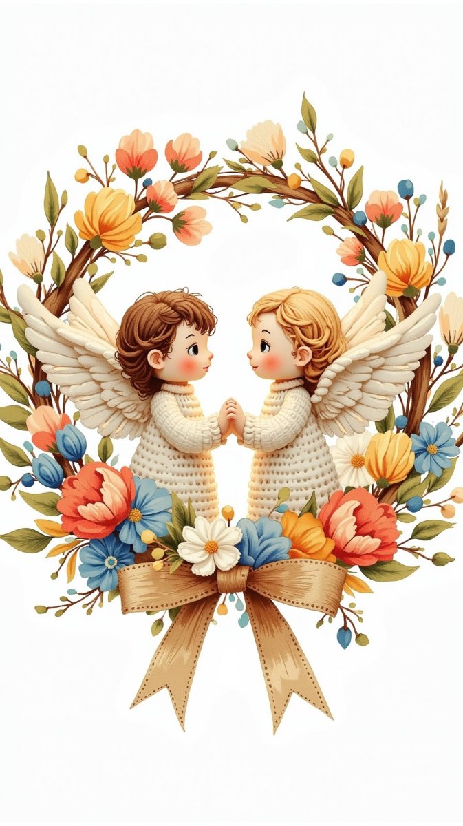 Ангелы вязаные крючком в весеннем венке с нежными цветами - Пример изображения из нейросети Flux Ai