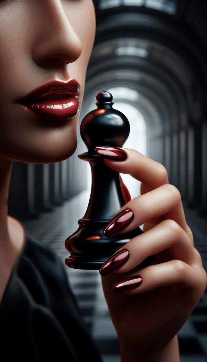 Загадочная композиция, где в центре внимания — рука, держащая черную шахматную фигуру. Яркий акцент создает маникюр с глянцевым красным лаком, а едва заметно приоткрытые губы добавляют интриги и загадочности образу. Размытый фон интерьера с высокими потолками и арками подчеркивает атмосферу таинственности и уединения. Игра света и тени создает драматический эффект, усиливая ощущение глубины и скрытого смысла. Кажется, будто за этой шахматной партией скрывается сложная история или тайная стратегия. Образ наполнен символизмом и вызывает множество вопросов, погружая зрителя в мир интриг и загадок. Это не просто фотография — это визуальная метафора о борьбе, стратегии и скрытых мотивах. Черный цвет фигуры указывает на силу, решительность и возможное противостояние, а красный маникюр добавляет нотку страсти и опасности. Вся сцена пронизана элегантностью и утонченностью, создавая неповторимую атмосферу таинственности и притягательности