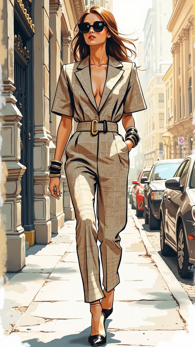 Элегантная мода встречается с искусством в этом захватывающем изображении. Яркий рисунок чернилами, дополненный цифровой акварелью и гуашью, представляет собой изысканную модную модель, воплощающую в себе наследие Коко Шанель и современный стиль Тома Форда. Она демонстрирует стильный комбинезон из твида – дань уважения классическим текстурам Шанель, но с глубоким V-образным вырезом, характерным для соблазнительного дизайна Форда. Аксессуары, такие как гладкие браслеты и крупные солнцезащитные очки, завершают образ, излучая уверенность и утонченность. Выражение лица модели и ее прямая осанка создают атмосферу высокой моды и современного обаяния на фоне динамичного городского пейзажа. Эта иллюстрация – идеальное сочетание классической элегантности и современной дерзости, демонстрирующее мастерство чернильных линий и яркие цветовые акценты цифровой живописи. Каждое штрих передает ощущение роскоши и изысканности, воплощая дух модных домов Chanel и Tom Ford в едином визуальном произведении. Это не просто иллюстрация – это ода современной женственности и безупречному стилю