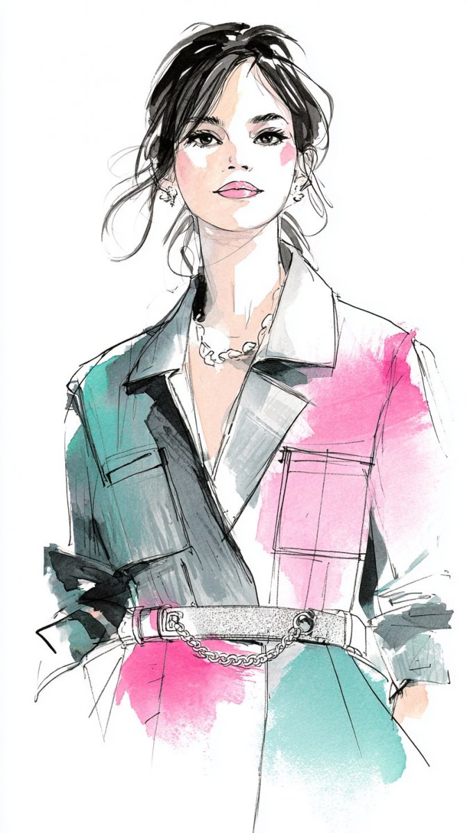 Ink drawing, illustration, digital watercolor and gouache, bold black outlines, translucent saturated color gradients showcase a fashion girl with vibrant pink and teal hues. She’s wearing a playful combination of Coco Chanel's classic tweed jacket, reimagined in a cropped silhouette with unique paneling, alongside the experimental draping techniques of Rei Kawakubo for Comme des Garçons; the jacket is paired with flowing, asymmetrical trousers in a pale grey linen. A simple silver chain belt cinches her waist, and her expression conveys effortless coolness and modern sophistication, capturing an urban aesthetic.