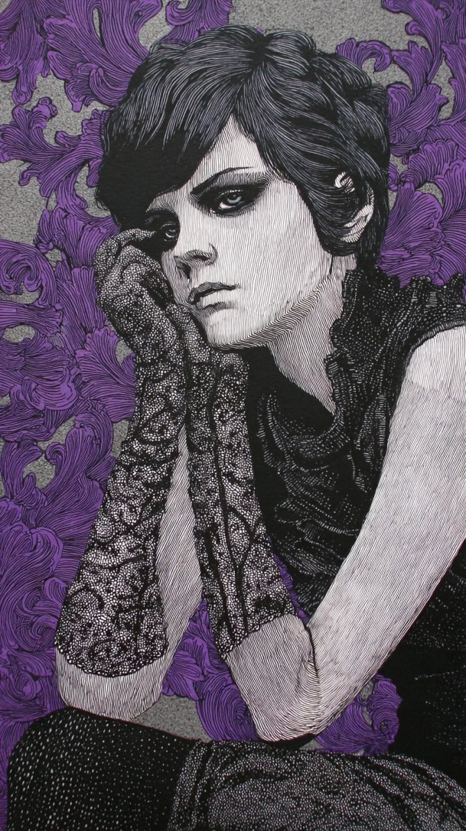 Завораживающая иллюстрация в технике чернильного рисунка и наивного искусства представляет собой образ меланхоличной готической девушки. Четкие контуры, выполненные смелым черным цветом, обрамляют ее лицо и подчеркивают тонкую красоту. Использование полупрозрачных градиентов гуаши, переходящих от глубокого пурпура к приглушенным серым оттенкам, создает ощущение глубины и задумчивости. В ее одежде гармонично сочетаются элементы темной романтики Рика Оуэнса и футуристических силуэтов Ирис ван Херпен. Платье, ниспадающее мягкими волнами, выполнено из драпированного бархата, напоминающего жидкую обсидиановую лаву. Лазерная резка создала сложные панели, имитирующие органические формы, а деликатные серебряные цепочки добавляют образу загадочности и утонченности. Девушка облачена в перчатки без пальцев, а ее выражение лица выражает глубокую задумчивость и интроспекцию. За ней простирается фон из буйной растительности, создавая контраст между искусственным и естественным, подчеркивая хрупкость и уязвимость персонажа. Это визуальное повествование исследует темы меланхолии, красоты и гармонии с природой в уникальном сочетании художественных стилей, предлагая зрителю погрузиться в мир темных фантазий и неземной элегантности. Композиция излучает атмосферу таинственности и внутренней силы, делая этот рисунок по-настоящему запоминающимся произведением искусства