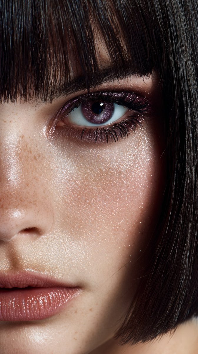 high-quality close-up of person's eye, deep purple iris, lace-up closure, shimmering metallic material, blurred brick wall, glamorous and elegant mood, layered manner, long dark eyelashes, short bob hairstyle with side-swept fringe, small white dots creating starry night sky, full glossy lips.