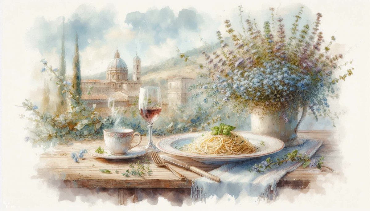 Уютная сцена, пропитанная атмосферой домашнего тепла и нежности. Мягкие акварельные тона и размытый фон создают ощущение спокойствия и умиротворения, словно запечатленный момент из воспоминаний. В центре внимания – просторный деревянный стол, занимающий всё пространство изображения, символизирующий обилие и гостеприимство. На столе аппетитно выглядит тарелка с дымящейся пастой спагетти, щедро посыпанной душистым орегано, вызывающая немедленный голод и желание попробовать этот кулинарный шедевр. Рядом – прозрачный стакан с горячим напитком, согревающий в прохладный день и дарящий ощущение комфорта. Неподалеку расположился изящный букет майорана с нежными маленькими голубыми цветами, добавляющий нотку свежести и природной красоты. За столом простирается удивительный пейзаж – причудливое сочетание итальянских пирамидальных тополь и русских берёз, символизирующее гармоничное переплетение культур и традиций. Эта композиция создает ощущение путешествия, где встречаются разные миры и времена года, а в центре всего этого великолепия – простота и радость повседневной жизни, наполненная вкусом, ароматом и красотой природы. Картина пробуждает самые теплые чувства и вызывает желание остаться в этом волшебном месте навсегда
