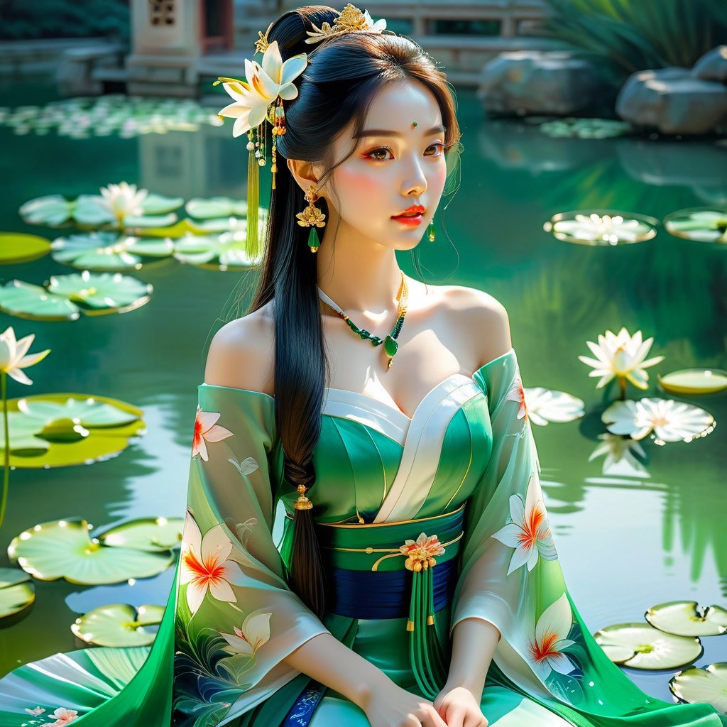 Изящная восточная красавица в струящемся ханьфу предстает на фоне живописного пруда, утопающего в зелени. Картина дышит светом и легкостью благодаря технике импрессионизма: мягкие мазки кисти создают ощущение мимолетности мгновения, а светлая палитра передает атмосферу утренней прохлады. Женщина, словно сотканная из солнечного света, запечатлена в момент задумчивости, ее лицо излучает спокойствие и красоту. Зеленое платье подчеркивает гармонию с окружающей природой, а аксессуары – нежный веер, изящный жадеитовый кулон и замысловатые украшения для волос – завершают образ утонченной восточной элегантности. На голове красуется традиционный головной убор, а длинные шелковистые волосы ниспадают волнами, обрамляя прекрасные черты лица. Лилия, отражающаяся в тихой глади воды, добавляет композиции нотку романтики и нежности. Вдали виднеются элементы восточной архитектуры, создающие ощущение гармонии между человеком и природой. Идеальные пропорции фигуры и изысканные детали подчеркивают мастерство художника, запечатлевшего неповторимую красоту момента. Картина словно оживает на глазах, передавая зрителю атмосферу умиротворения и восторга. Это не просто портрет – это поэма света, цвета и формы, воплощенная в импрессионистской технике