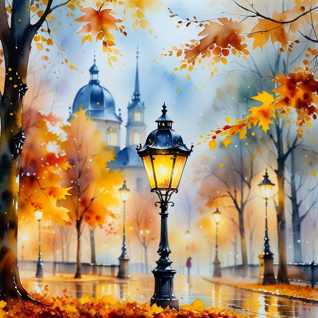 wet watercolor, spraying, transparent pigments, splashes, tenderness, blurriness, the style of the artist Reine-Marie Pinchon. Lonely lamp post in an autumn park, surrounded by golden leaves and mist, cinematic night bokeh.