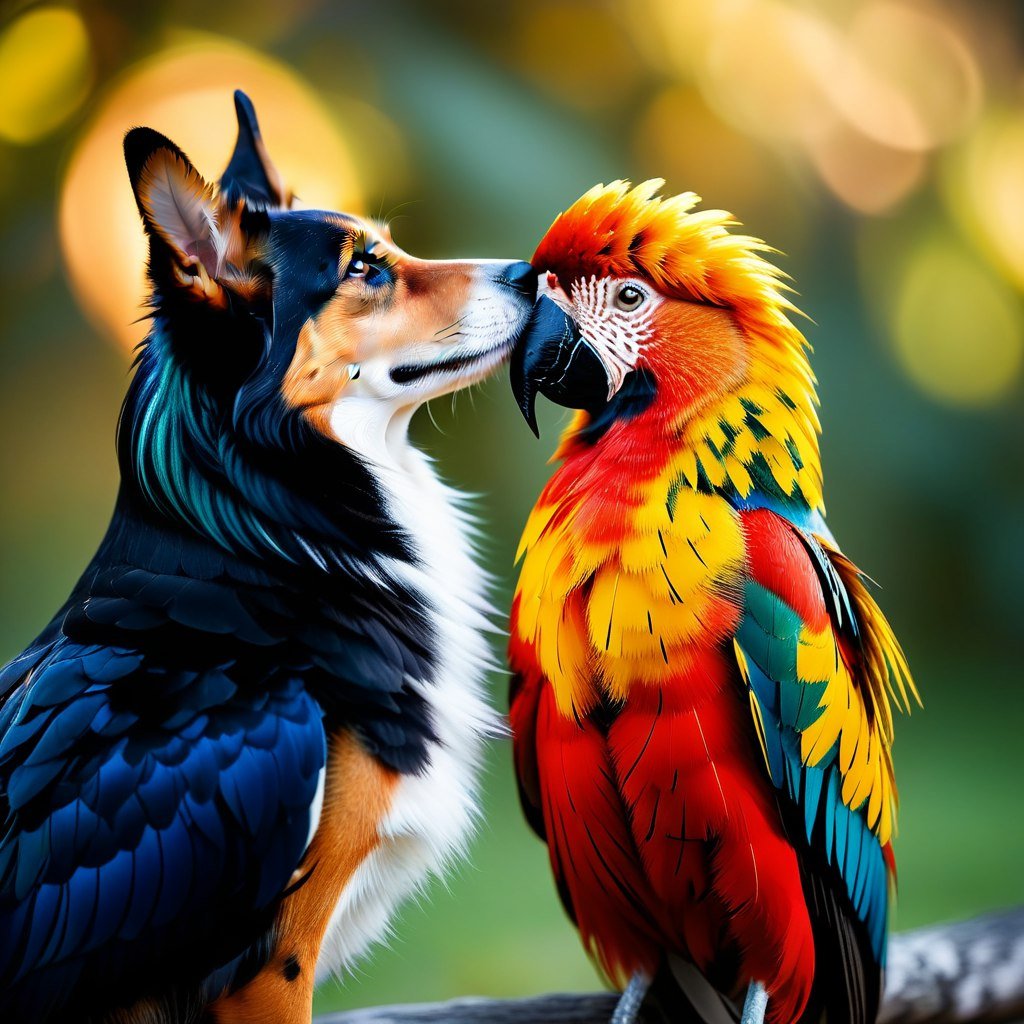 The lighting is soft and well-balanced, highlighting the texture of the dog's fur and the vibrant color of the bird's plumage.