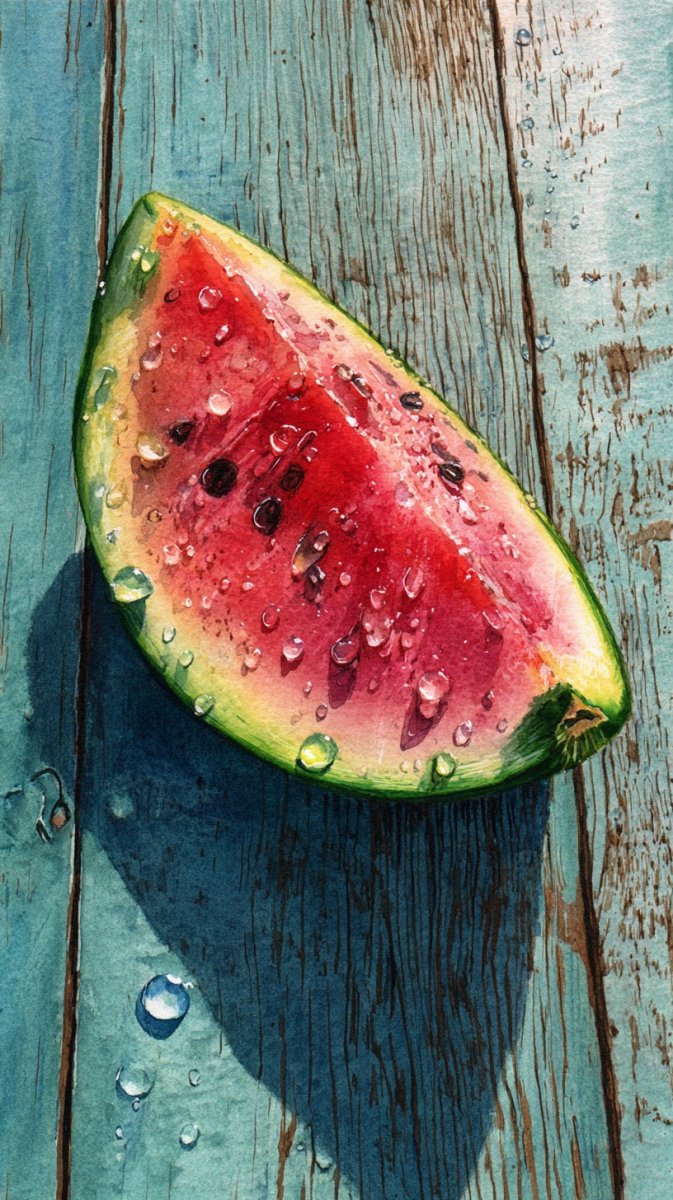 watercolor illustration of slice of watermelon on cutting board, bright pink flesh with black seeds, green rind, few drops of water glistening, rustic wooden surface, summer vibes.
