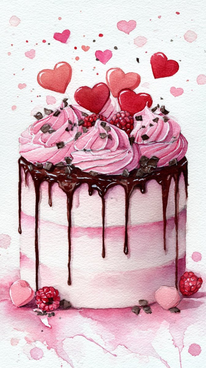 watercolor painting of cake with pink whipped cream over sides, drizzle of sauce, chocolate smaller than bottom, few red hearts scattered, romantic and whimsical style.