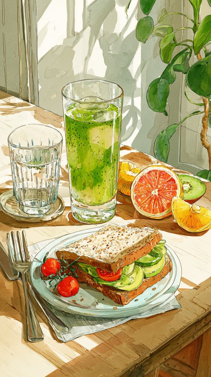 watercolor illustration of breakfast meal on table, glass of green smoothie, sandwich with avocado, cherry tomatoes, kiwi sliced oranges, fork and knife on table, bright and cheerful style.