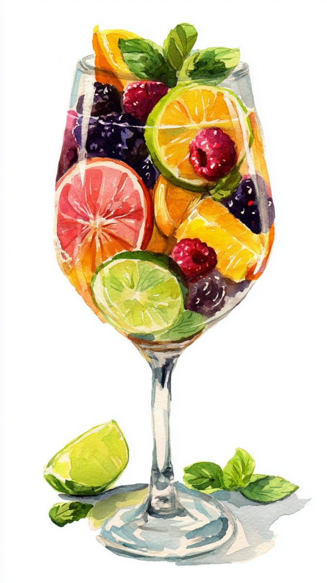 watercolor illustration of glass filled colorful fruit cocktail, slices of orange, grapefruit, raspberries, blackberries, lime, a few mint leaves scattered around glass, vibrant style.