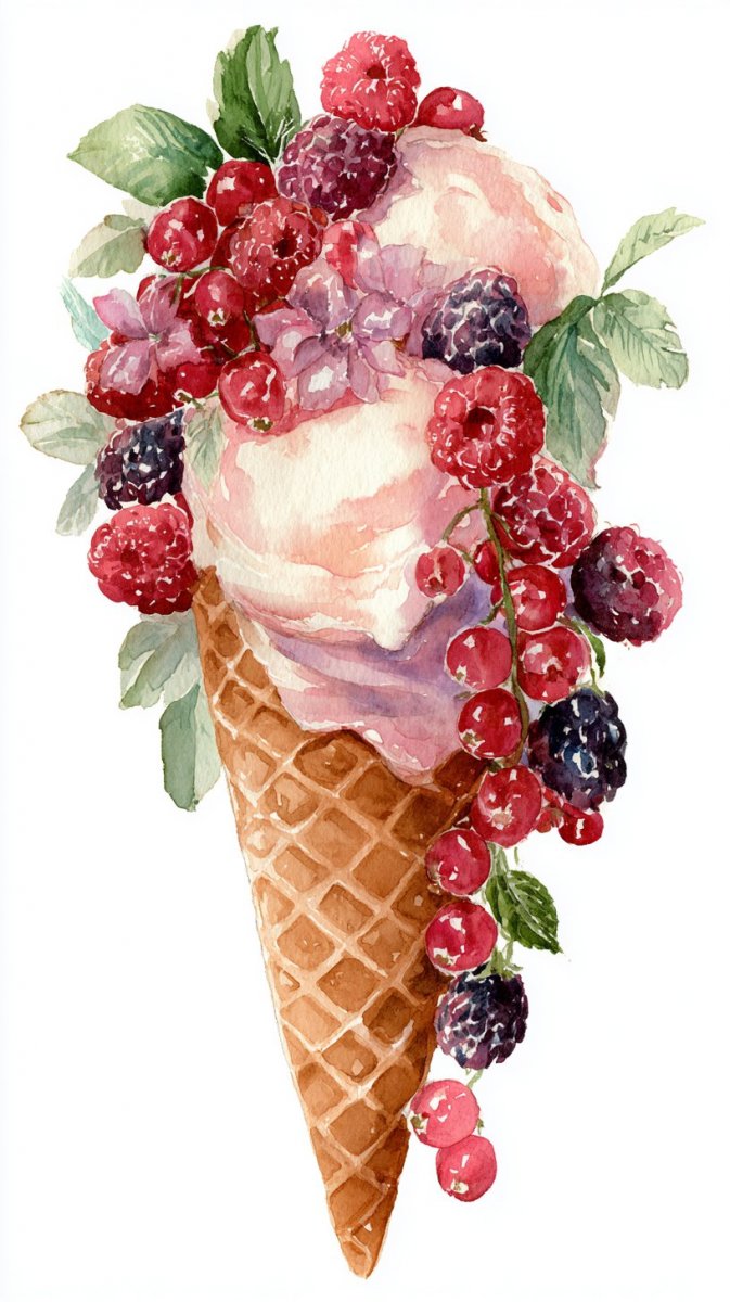 Изысканная акварельная иллюстрация, посвященная летнему лакомству – аппетитному рожке мороженого. В центре композиции возвышается хрустящий вафельный конус, словно произведение искусства, наполненное нежьтелью кремового мороженого. Яркие и сочные свежие малины и ежевика живописно разбросаны вокруг конуса, создавая ощущение щедрой и ароматной сладости. Стиль изображения – витиеватый и игривый, с акцентом на детали и передающий атмосферу беззаботного веселья. Нежные переходы цвета и мягкие линии придают картине легкость и воздушность. Эта иллюстрация идеально подойдет для оформления десертных меню, открыток или любых проектов, связанных с темой лета, сладостей и радости. В ней чувствуется тепло солнечного дня и вкус любимого мороженого. Кажется, будто можно почувствовать легкий аромат ягод и услышать хруст вафельного конуса. Яркие цвета и детализированная проработка создают ощущение реализма, при этом сохраняя очарование акварельной техники. Это не просто изображение, а целая история о летнем наслаждении и счастливых моментах. Картина излучает позитив и вдохновляет на создание чего-то прекрасного. Она словно приглашает зрителя окунуться в мир сладостей и ощутить радость жизни
